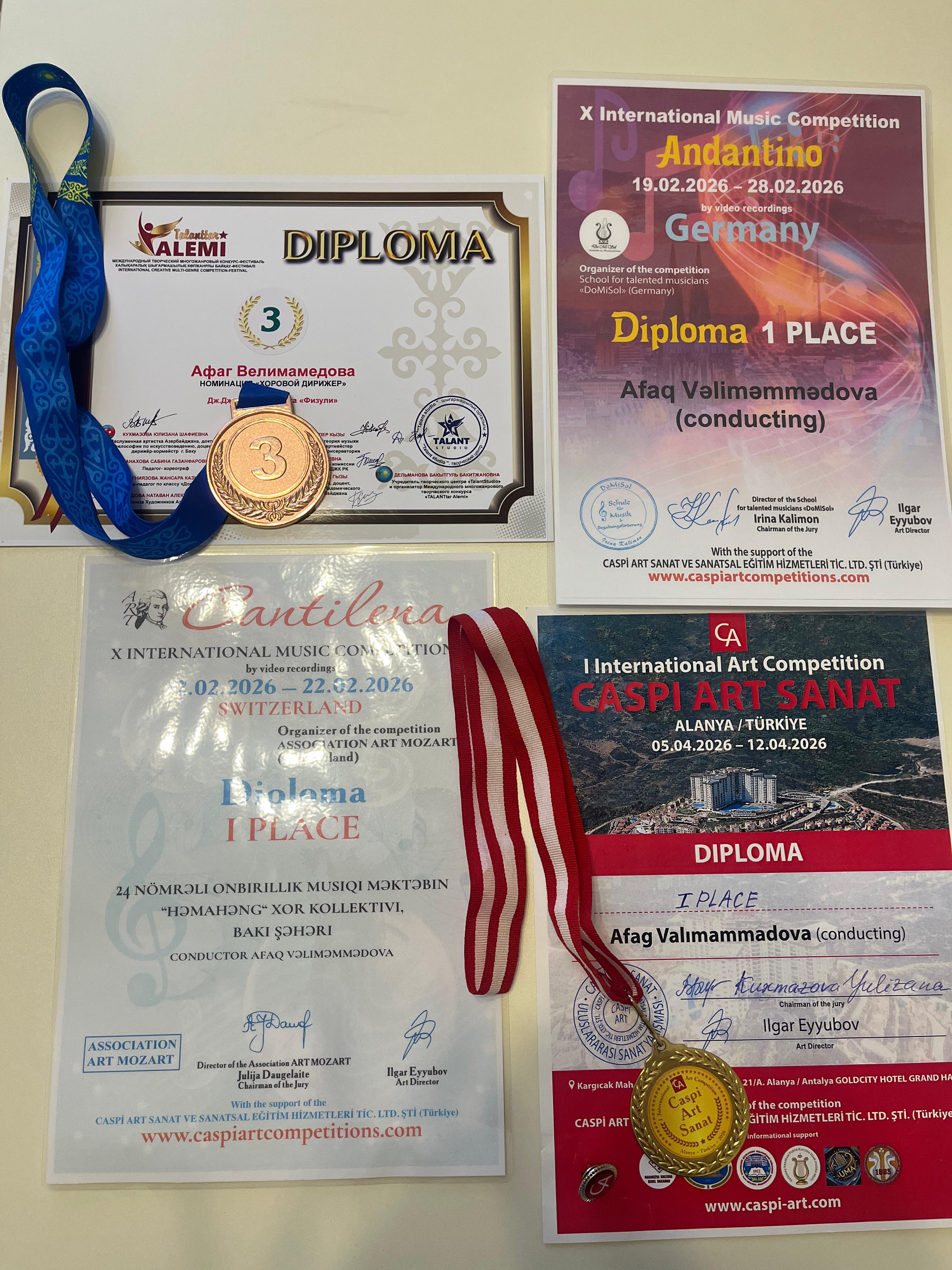 5-12 aprel tarixlərində Türkiyənin Alanya şəhərində keçirilmiş I Beynəlxalq “Caspi Art Sanat” beynəlxalq müsabiqə-festivalında Azərbaycandan həmyerlimiz Afaq Vəliməmmədova uğurla iştirak edərək, dirijorluq nominasiyası üzrə I yerə layiq görülüb.