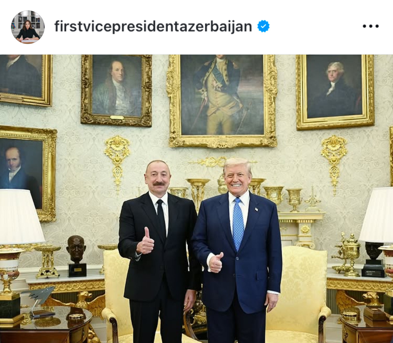 Birinci vitse-prezident Mehriban Əliyeva sosial şəbəkə hesabında Azərbaycan Prezidenti İlham Əliyev, ABŞ lideri Donald Tramp və Ermənistanın baş naziri Nikol Paşinyanın Vaşinqtondakı görüşü ilə bağlı paylaşım edib.