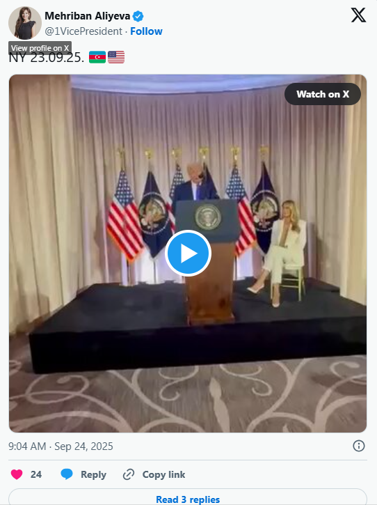 Azərbaycanın Birinci vitse-prezidenti Mehriban Əliyeva Prezident İlham Əliyevin Donald Trampın Nyu-Yorkdakı dialoqunun videosunu paylaşıb.