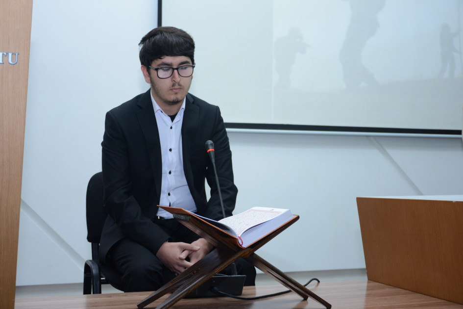 Daha sonra İlahiyyat fakültəsinin II kurs tələbəsi Cəlal Cəfərli tərəfindən şəhidlərimizin ruhuna Quran tilavəti təqdim edilib.