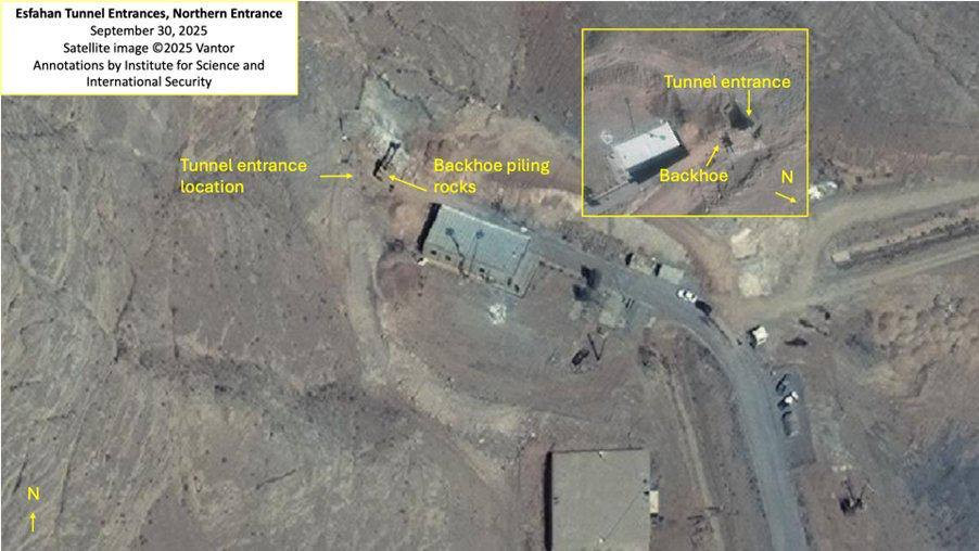 Sentyabrın sonu və oktyabrın əvvəlinə aid peyk görüntüləri göstərir ki, İran İsfahandakı üç tunel girişindən ikisini təmizləyib, əraziyə ağır texnika cəlb edərək təhlükəsiz giriş üçün möhkəmləndirmə işlərinə başlayıb.