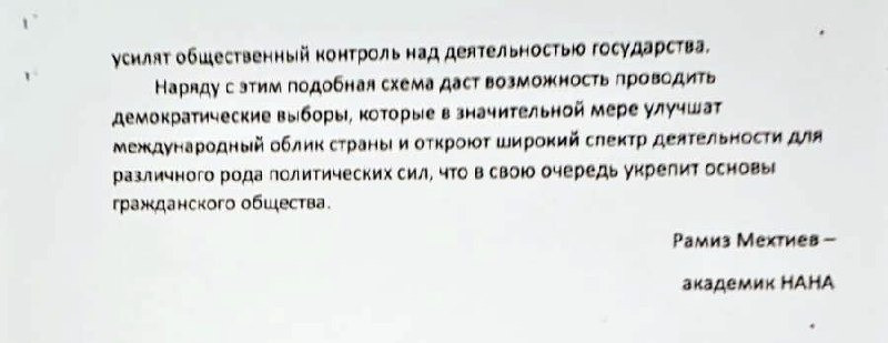 “Son illərdə Azərbaycanda dövlət idarəetmə sistemini, eləcə də iqtisadi həyatı əhatə edən dərin böhran köklü islahatların və dəyişikliklərin aparılmasını tələb edir. Bir tərəfdən mövcud idarəetmə strukturunun səmərəsizliyi mövcud hökumətin xarakteri, əxlaqı və baxışları ilə izah olunursa, digər tərəfdən bu struktur avtoritarizm tərəfindən iflic edilmiş qəddar bir ruhla bağlıdır.