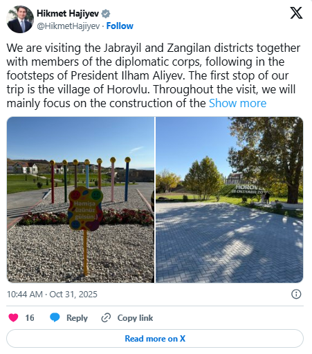 "Biz diplomatik korpusun üzvləri ilə birlikdə Prezident İlham Əliyevin izi ilə gedərək Cəbrayıl və Zəngilan rayonlarına səfər edirik. Səfərimizin ilk dayanacağı Horovlu kəndidir. Ziyarət çərçivəsində əsas diqqət Zəngəzur dəhlizinin tikintisinə, həmçinin bölgədə həyata keçirilən dəmir yolu və avtomobil yolu layihələrinə yönələcək. 2020-ci il Vətən müharibəsindən bəri bu, diplomatik korpusla birlikdə azad edilmiş ərazilərə 20-ci səfərimizdir", - paylaşımda qeyd edib.