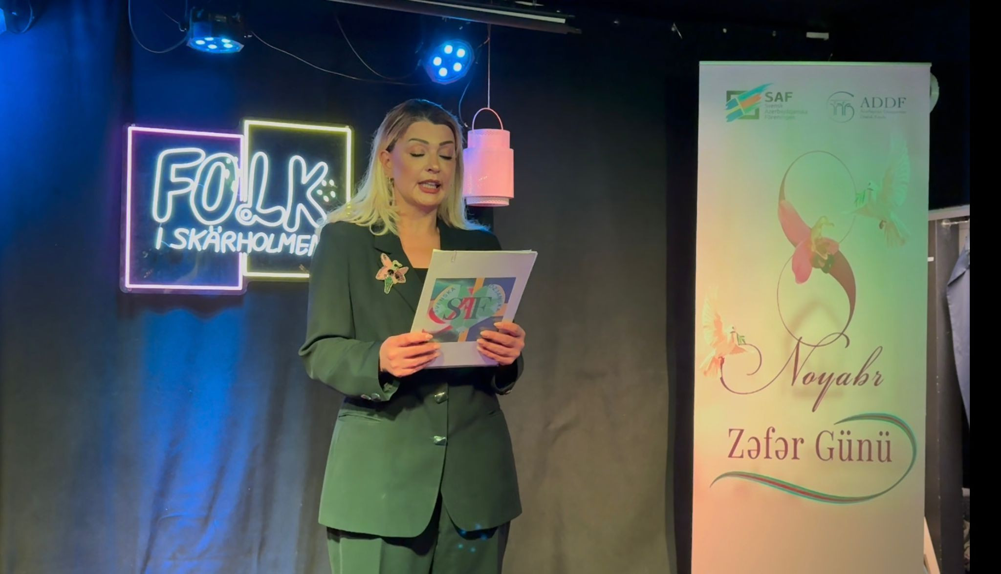 İsveç – Azərbaycan Birliyinin sədri Sevda Dadaşova çıxışında uzun illər işğal altında qalan torpaqlarımızın Müzəffər Ali Baş Komandan, Prezident İlham Əliyevin rəhbərliyi, şəhidlərimizin qanı, qazilərimizin fədakarlığı və xalqımızın sarsılmaz iradəsi sayəsində azad olunduğunu vurğulayıb. “Bu gün dünyada müharibələr davam etsə də, biz qalib xalq olaraq sülhün, ədalətin və insanlığın tərəfində dayanırıq. Qarabağda tikilən hər ev, hər məktəb, əkilən hər ağac yeni həyatın simvoludur,” – deyə o bildirib.