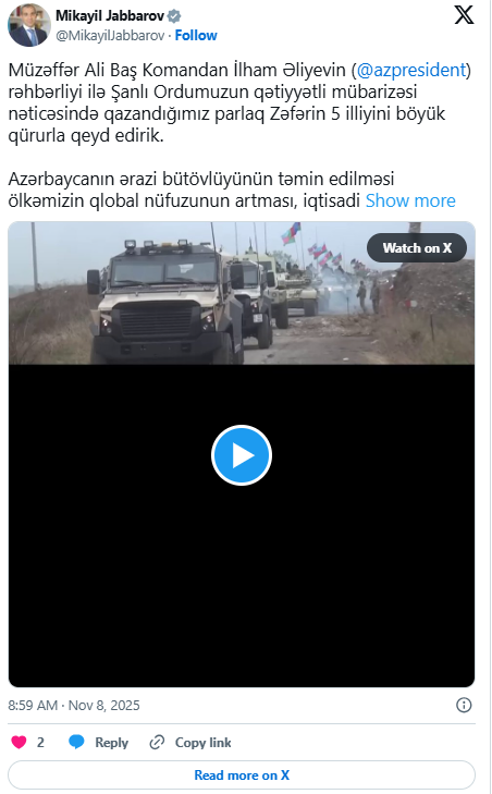 İqtisadiyyat naziri, Azərbaycan Dövlət Neft Şirkətinin Müşahidə Şurasının sədri Mikayıl Cabbarov 8 noyabr – Zəfər Günü ilə bağlı paylaşım edib.