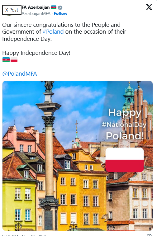 "Polşa xalqını və hökumətini Müstəqillik Günü münasibətilə səmimi qəlbdən təbrik edirik. Müstəqillik Gününüz mübarək!" - paylaşımda vurğulanıb.