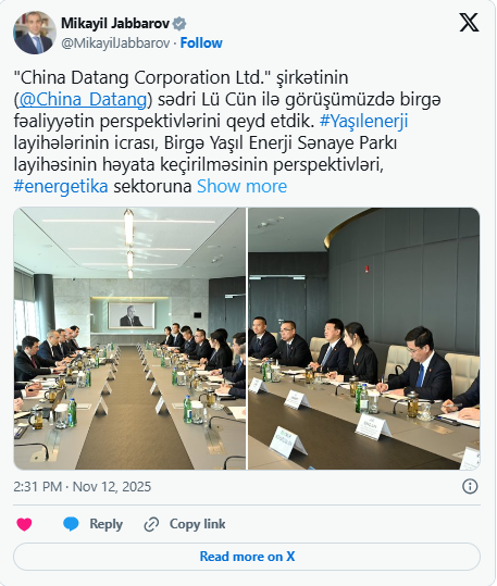 Azərbaycan Çinin "China Datang Corporation Ltd." şirkəti ilə Birgə Yaşıl Enerji Sənaye Parkı layihəsinin həyata keçirilməsinin perspektivlərini müzakirə edib.