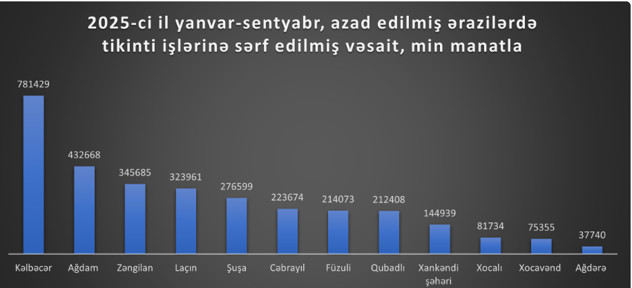 İşğaldan azad edilmiş rayonlarda tikinti-quraşdırma işlərinə 2025-ci ilin yanvar-sentyabr ayları ərzində bütün maliyyə mənbələri hesabına 3 milyard 150 milyon 268 min manat vəsait sərf edilib.