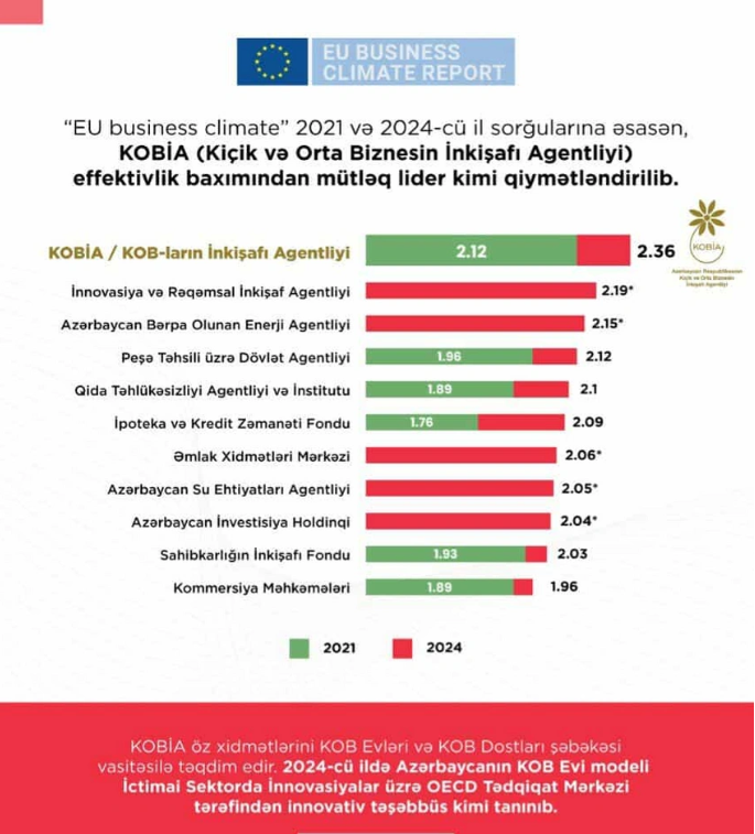 Crossmedia.az xəbər verir ki, Avropa şirkətlərinin yerli islahatlarda irəliləyişə dair baxışları haqqında sorğunun nəticələrinə əsasən İqtisadiyyat Nazirliyi yanında Kiçik və Orta Biznesin İnkişafı Agentliyi (KOBİA) üç ən effektiv dövlət qurumundan biri kimi qiymətləndirilib.