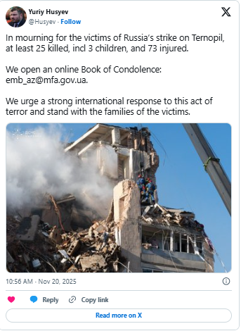 “Rusiyanın Ternopilə endirdiyi zərbə nəticəsində ən azı 25 nəfər həlak olub. Eyni zamanda, 3 uşaq və 73 nəfər yaralanıb. Biz onlayn başsağlığı kitabı açırıq.