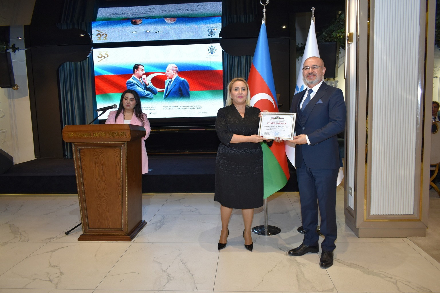 Yeni Azərbaycan Partiyası Mərkəzi Aparatının Təşkilat şöbəsinin müdir müavini Rafael Gülməmmədov ilk öncə ilk öncə tədbir iştirakçılarına Yeni Azərbaycan Partiyası yaradılmasının 33-cü ildönümü münasibətilə Yeni Azərbaycan Partiyası Sədrinin müavini- YAP Mərkəzi Aparatının rəhbəri Tahir Buraqovun salamlarını və təbriklərini çatdırıb. Vurğulanıb ki, Yeni Azərbaycan Partiyası dövlətimizin müstəqilliyinin, ərazi bütövlüyünün qorunması, ölkəmizin beynəlxalq aləmdə layiqli yer tutması kimi əsas partiya prinsiplərini həyata keçirməklə cəmiyyətdə yüksək nüfuza malik olub: “Gələcəyə doğru inamla irəliləyən Yeni Azərbaycan Partiyası Prezident cənab İlham Əliyevin rəhbərliyi ilə ölkəmizin daha da qüdrətlənməsi istiqamətində ciddi səylər göstərir. Bu gün Prezident cənab İlham Əliyevin sədrlik etdiyi Yeni Azərbaycan Partiyasının Cənubi Qafqazın ən böyük siyasi təşkilatı olaraq nüfuzu davamlı olaraq artır. Son illər Azərbaycanın dünya arenasında nüfuzunun xeyli artması digər dövlətlərin ölkəmizə marağını daha da gücləndirib.” Ölkəmizin əldə etdiyi zəfərlər və onun siyasi müstəvidə daha da möhkəmləndirilməsində Yeni Azərbyacan Partiyasının müstəsna xidməti olub.