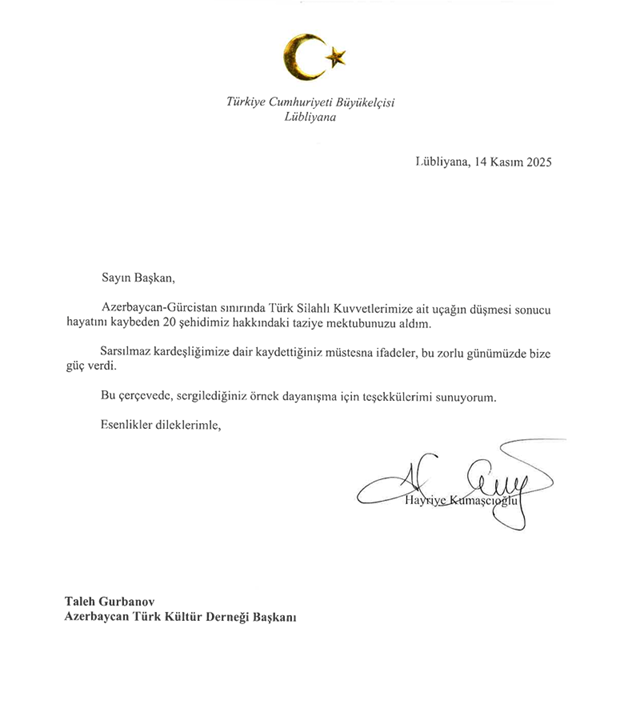 Sloveniyada fəaliyyət göstərən Azərbaycan Türk Mədəniyyəti Assosiasiyasının prezidenti Taleh Qurbanov Türkiyəyə məxsus hərbi yük təyyarəsinin Gürcüstan ərazisində qəzaya uğraması ilə bağlı qardaş ölkənin Sloveniyadakı səfiri Hayriye Kumaşcıoğluna başsağlığı məktubu göndərib.