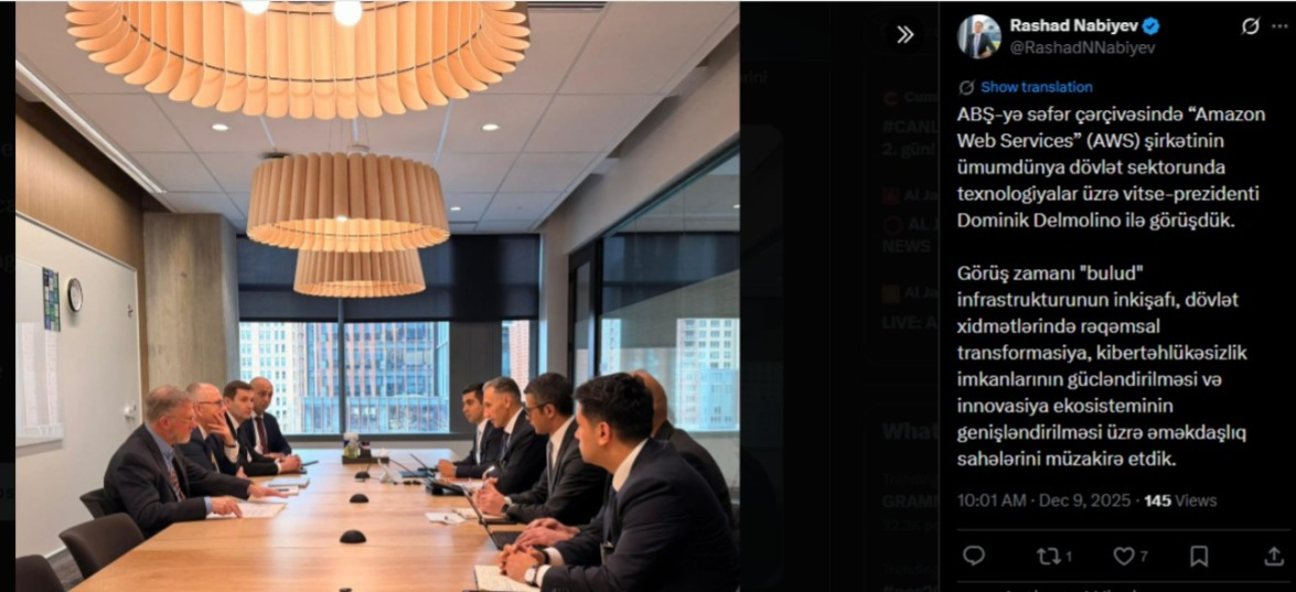 "ABŞ-yə səfər çərçivəsində “Amazon Web Services” (AWS) şirkətinin ümumdünya dövlət sektorunda texnologiyalar üzrə vitse-prezidenti Dominik Delmolino ilə görüşdük. Görüş zamanı "bulud" infrastrukturunun inkişafı, dövlət xidmətlərində rəqəmsal transformasiya, kibertəhlükəsizlik imkanlarının gücləndirilməsi və innovasiya ekosisteminin genişləndirilməsi üzrə əməkdaşlıq sahələrini müzakirə etdik", - paylaşımda bildirilib.