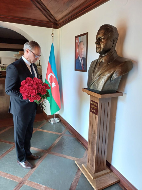 Crossmedia.az xəbər verir ki,səfirlikdən verilən məlumata görə, əvvəlcə səfirlik kollektivi diplomatik missiyanın inzibati binasında Ulu Öndərin büstü qarşısına tər çiçəklər düzüb, dahi liderin əziz xatirəsini sükutla yad edib.