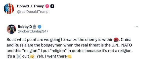 “Çin və Rusiya təhlükəlidir, amma əsl təhlükə BMT, NATO və bu ‘din’dır. ‘Din’ sözünü dırnaq içində yazıram, çünki bu, həqiqi din deyil, bir sektadır.”