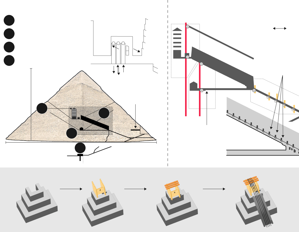Tədqiqata görə, piramida yalnız xarici rampalar vasitəsilə deyil, həm də onun daxilində gizlədilmiş əks-çəki və kasnak mexanizmləri ilə inşa edilib.