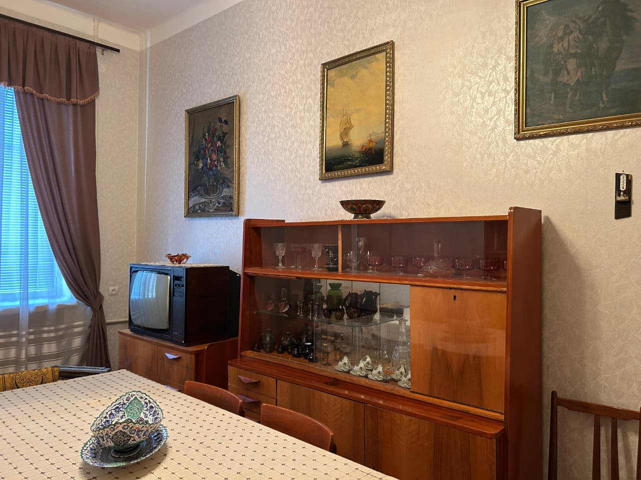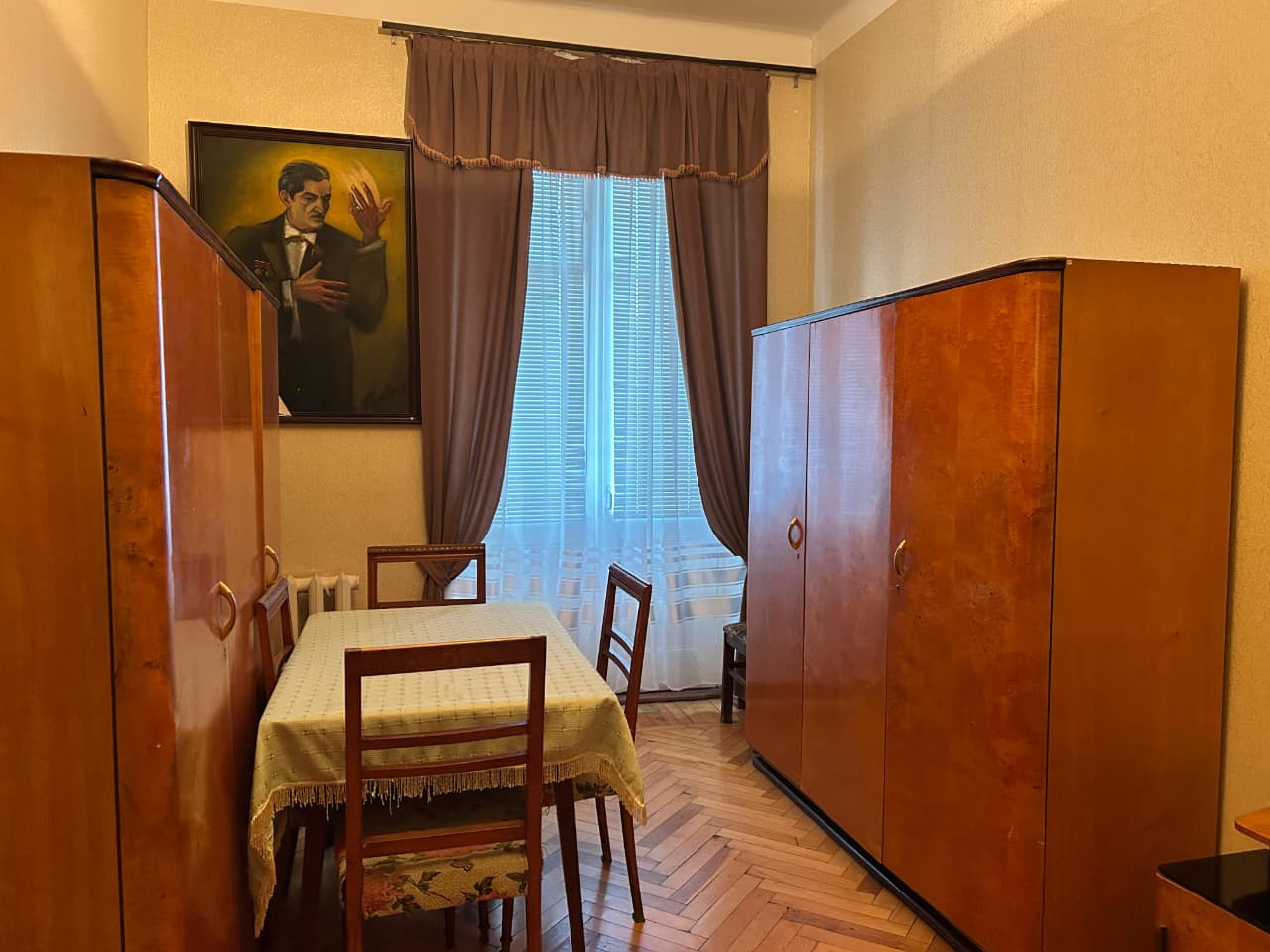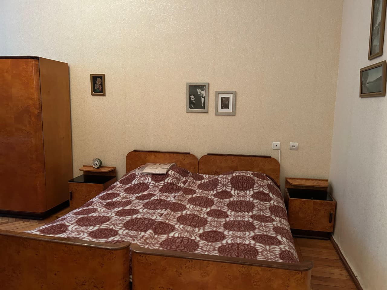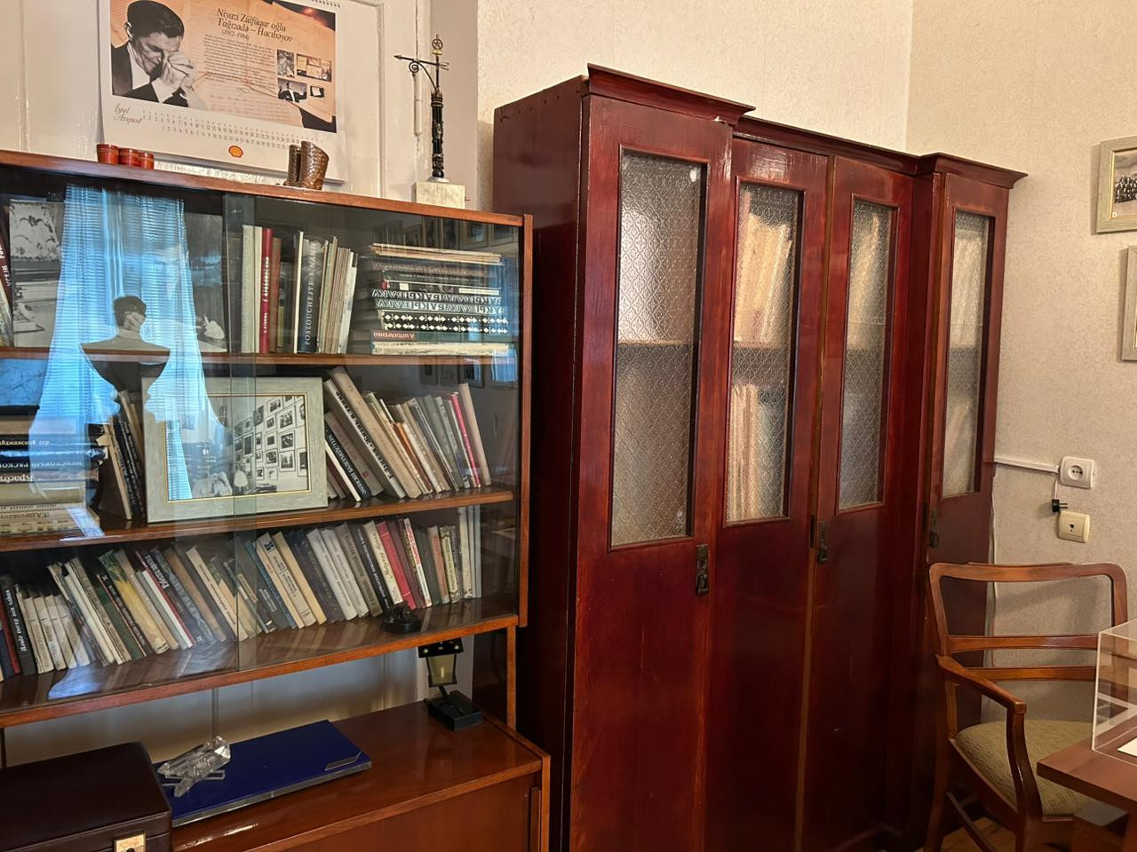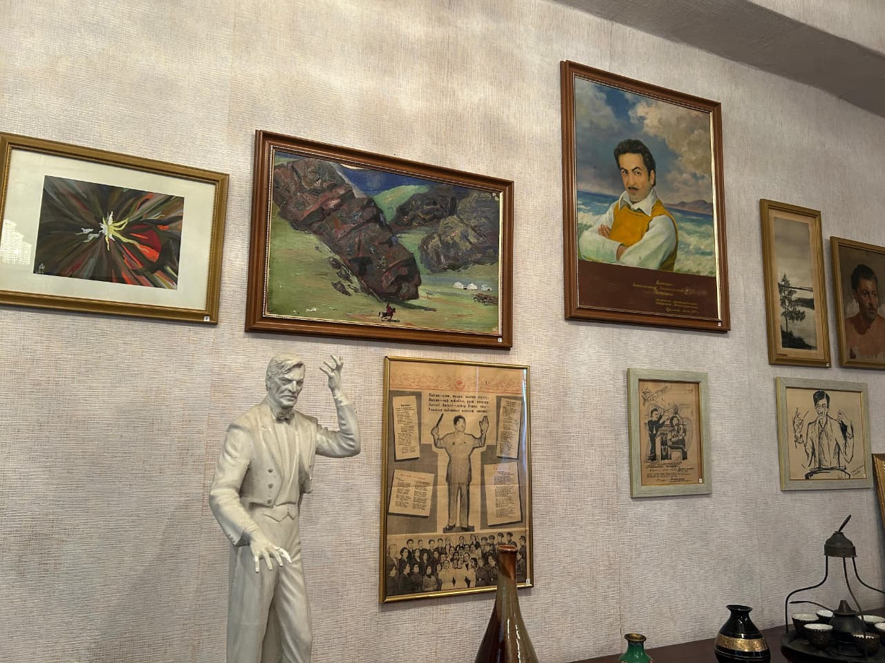 Şkafın üzərində Niyazinin 1960-cı illərdə çəkilmiş fotoportreti asılmışdır. Otağın divarlarını müxtəlif vaxtlarda maestroya hədiyyə edilmiş bədii sənət nümunələri bəzəyir. Pəncərənin sol tərəfində İran rəssamı, Həcər xanımın qohumu Bəhruz Kafinin 1978-ci ildə quaş və akvarel texnikasında işlədiyi “Niyazinin portreti” yer alır. Televizorun üzərində naməlum rəssama aid “Güllər” natürmortu, onun yanında isə İ.K. Ayvazovskinin “Dənizdə səhər” və Ejen Delakruanın “Mərakeşli ata minərkən” əsərlərinin surətləri təqdim olunur. Digər divarda isə 1953-cü ildə xalq rəssamı Böyükağa Mirzəzadənin işlədiyi Həcər xanımın portreti asılmışdır.