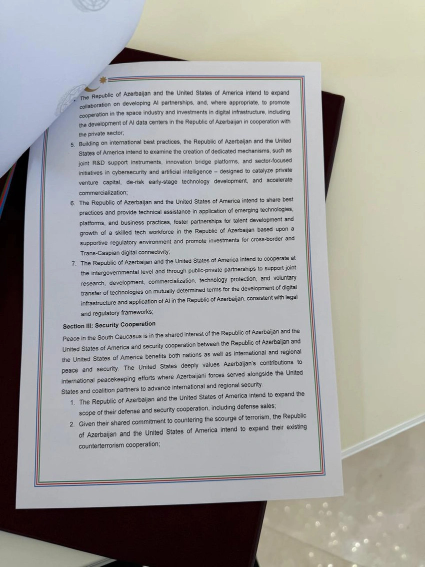 - Azərbaycan Respublikası və Amerika Birləşmiş Ştatları AI tərəfdaşlıqlarının inkişaf etdirilməsi üzrə əməkdaşlığı genişləndirmək və müvafiq hallarda, kosmik sənaye sahəsində əməkdaşlığı və Azərbaycan Respublikasında özəl sektorla əməkdaşlıq ilə AI data mərkəzlərinin inkişafı da daxil olmaqla, rəqəmsal infrastruktura sərmayə qoyuluşunu təşviq etmək niyyətindədirlər;
