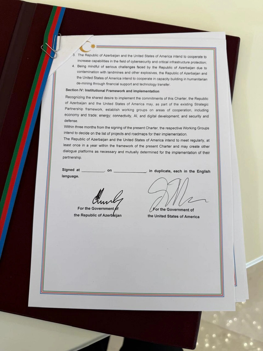 Crossmedia.az xəbər verir ki, "Azərbaycan Respublikası Hökuməti ilə Amerika Birləşmiş Ştatları Hökuməti arasında Strateji Tərəfdaşlıq Xartiyası"nı Azərbaycan tərəfindən Prezident İlham Əliyev, ABŞ tərəfindən isə vitse-prezident Cey Di Vens imzalayıblar.