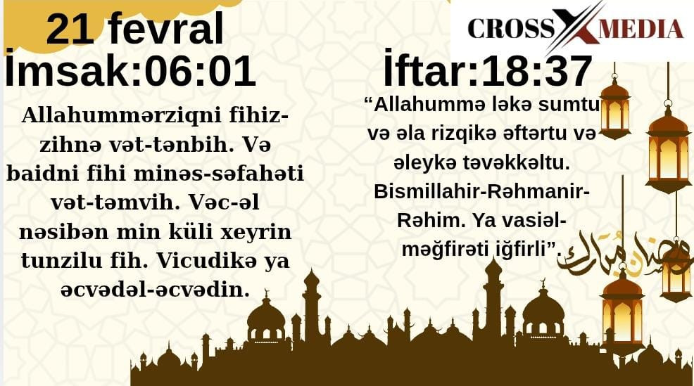 Crossmedia.az xəbər verir ki, imsak vaxtı 06:01-ə, iftar isə 18:37-yə təyin olunub.
