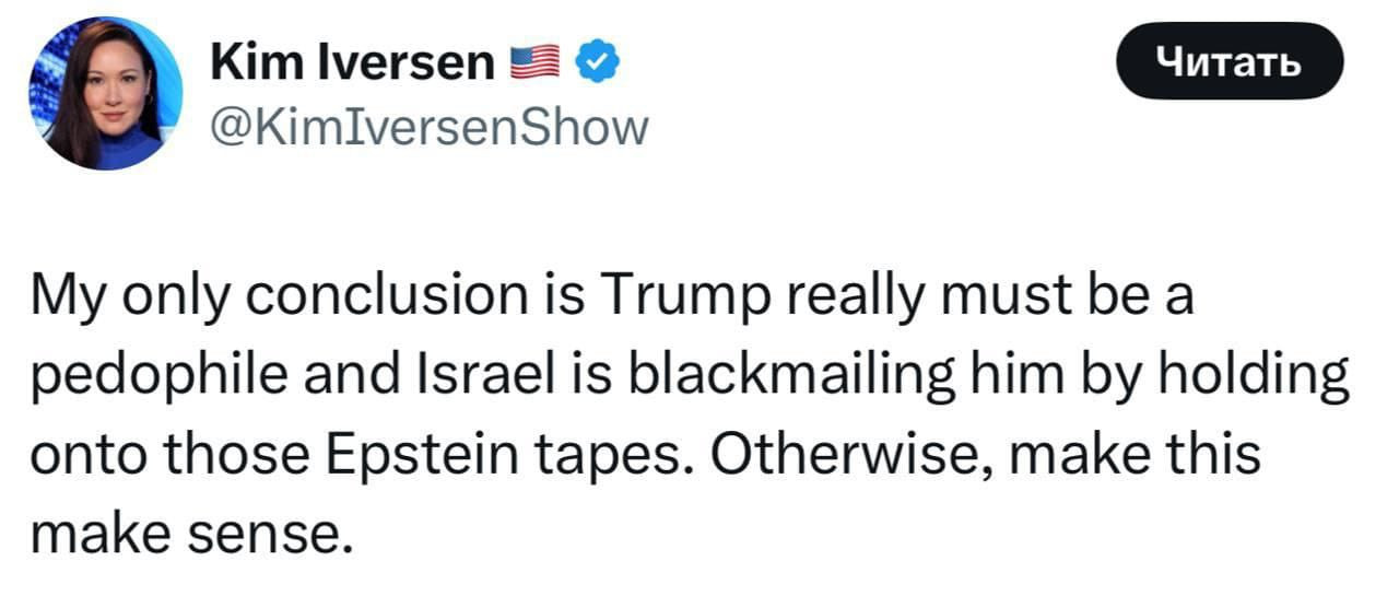 O bildirib ki, Trampın pedofiliya ilə əlaqəli ola biləcəyi və İsrailin Epşteynlə bağlı səs yazılarını saxlayaraq siyasətçini şantaj etdiyi ehtimal olunur.