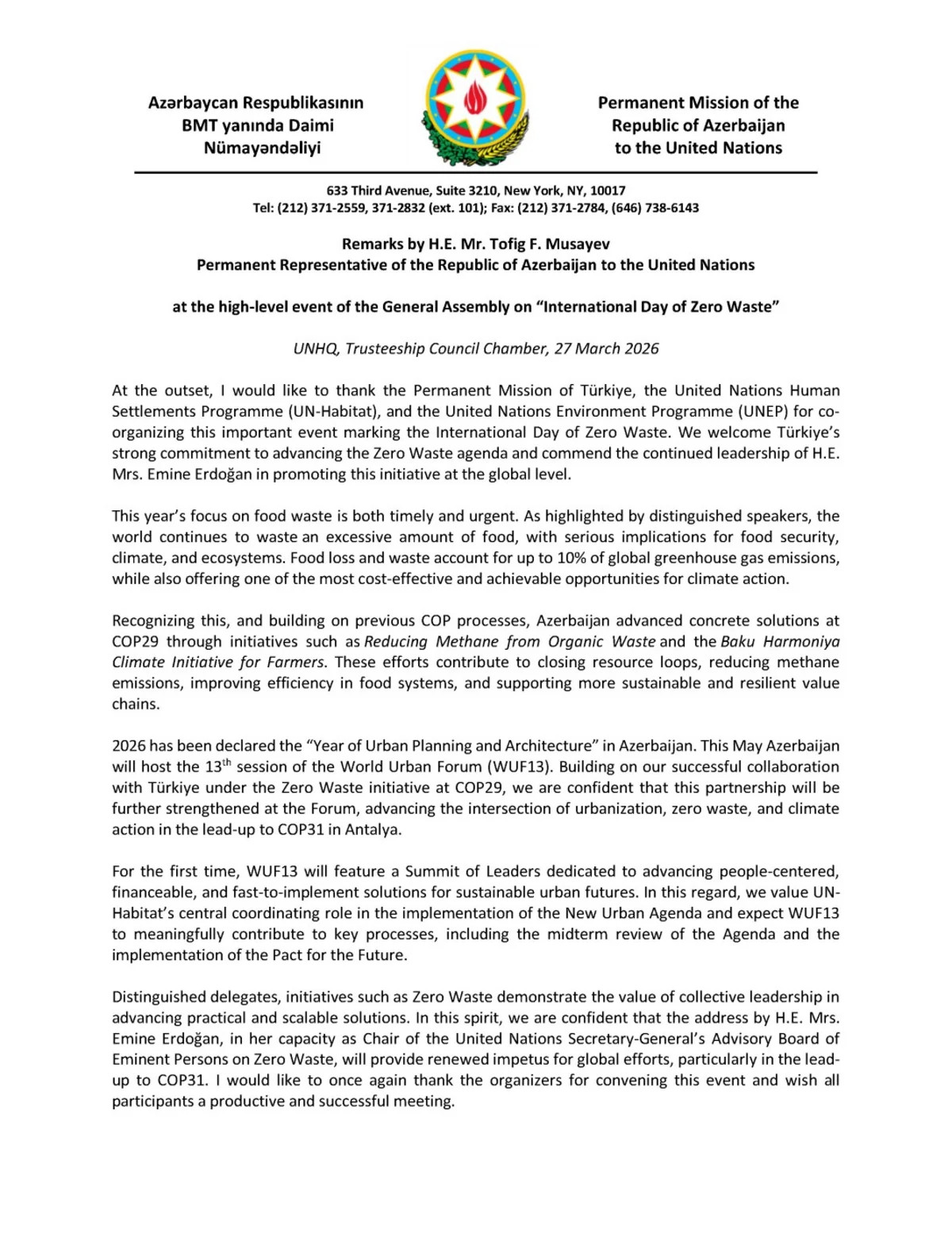 BMT-də Beynəlxalq Sıfır Tullantı Günü (International Day of Zero Waste) ilə bağlı tədbir keçirilib və Azərbaycanın BMT yanında daimi nümayəndəsi, səfir Tofiq Musayev də iştirakçılar arasında olub.