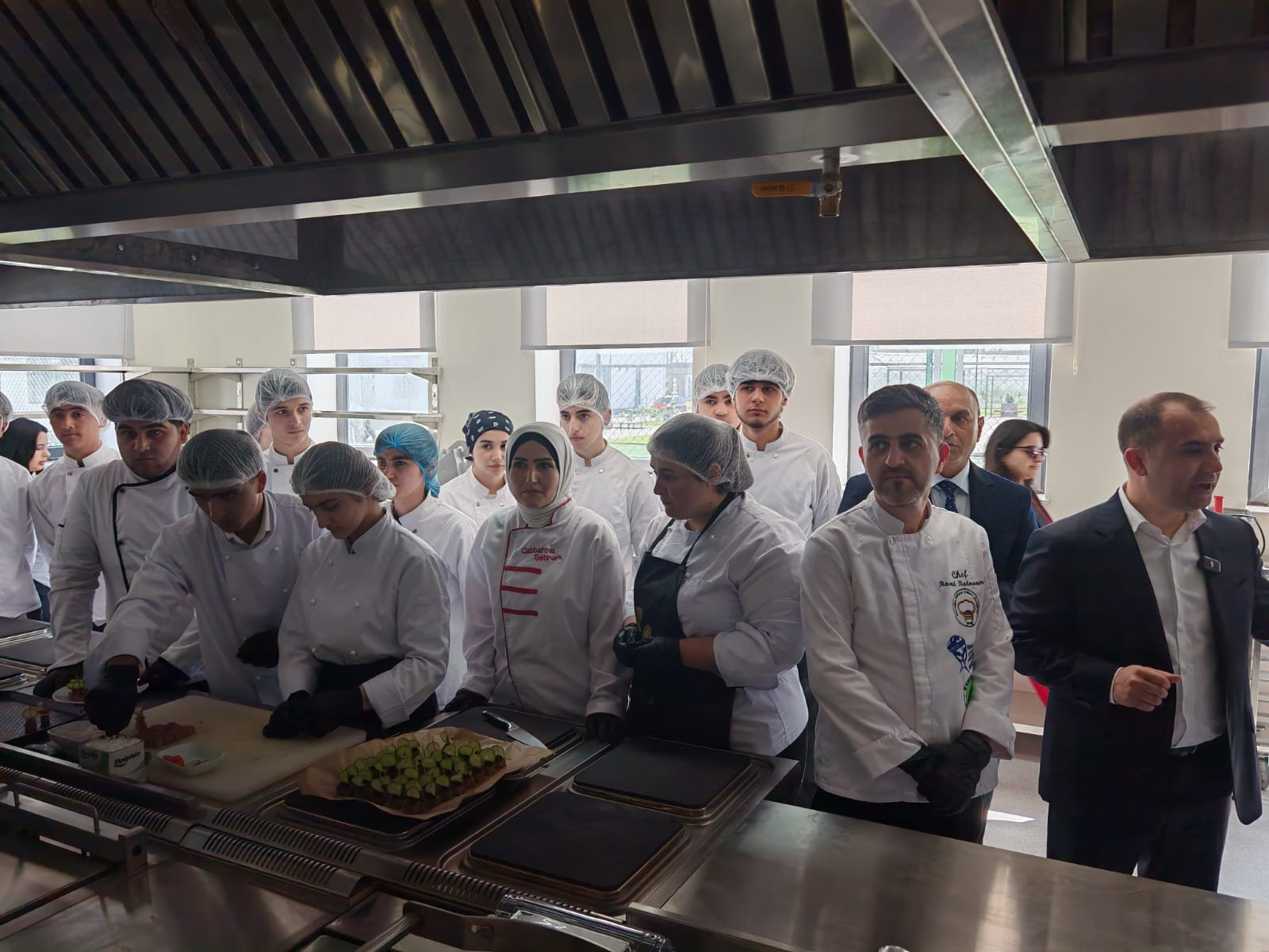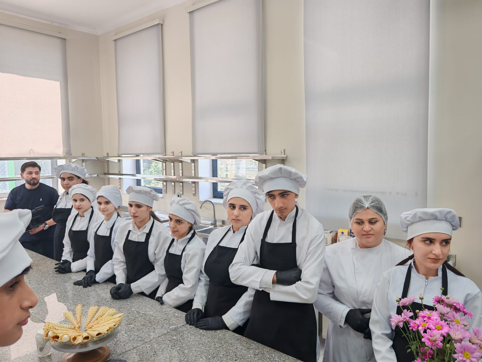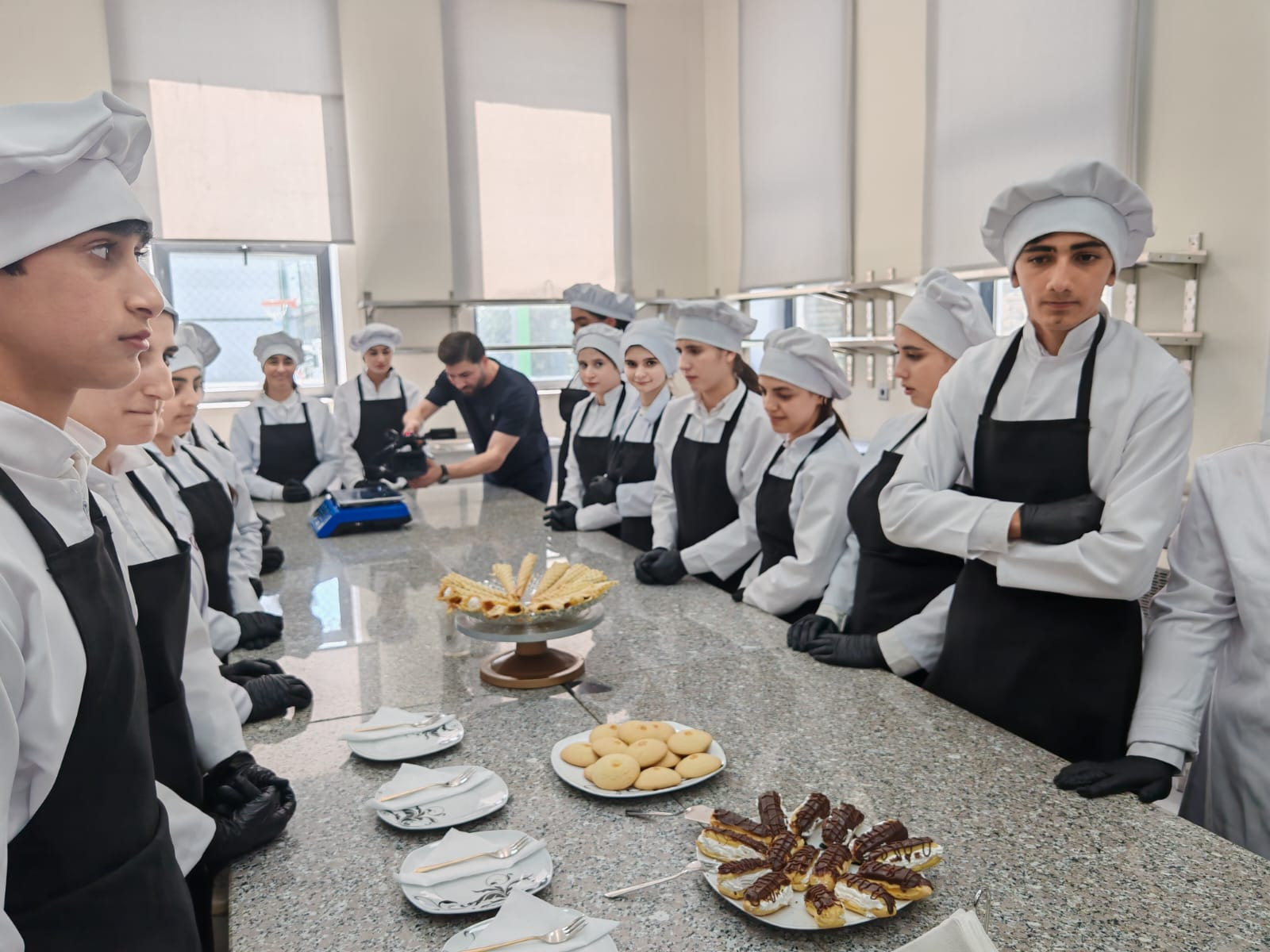 Daha sonra yolumuz aşpazlıq və qənnadı emalatxanasından keçdi. Ağ rəngli aşpaz papaqları altında cəmləşən gənc simaların hazırladığı şirniyyatlar və un məmulatları həm vizual, həm də dad baxımından heç də peşəkar restoranlardan geri qalmır. Burada gənclər xəmirin sehrini və kulinariyanın incəliklərini böyük bir həvəslə öyrənirlər.
