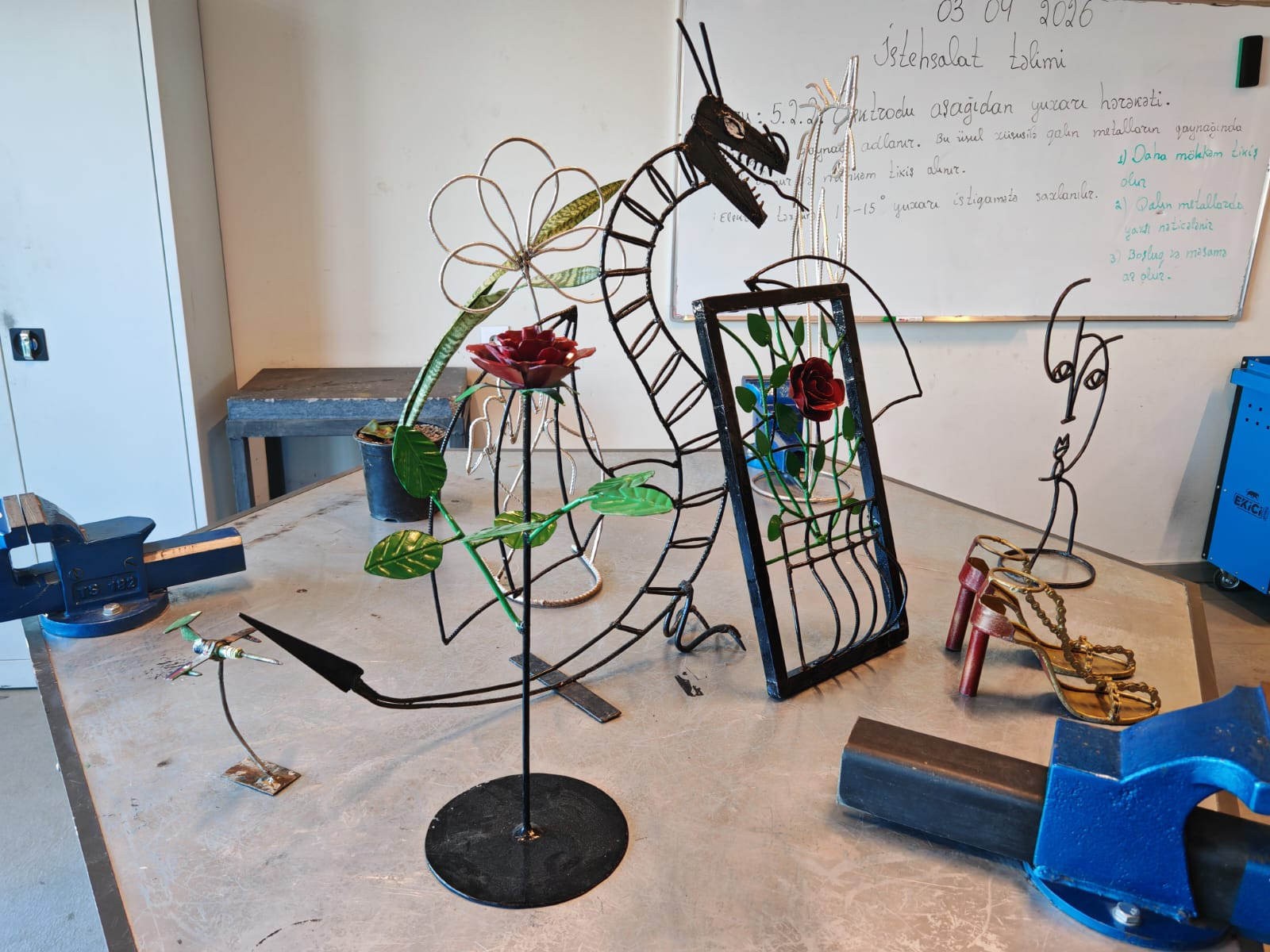 Ancaq peşə təhsili yalnız texnika demək deyil, həm də incəsənətdir. Metal üzərində iş və qaynaq emalatxanasında qarşılaşdığımız dəmirdən hazırlanmış "əjdaha" və "gül" fiqurları bizi valeh etdi. Qaba və soyuq metalın incə sənət əsərinə çevrilməsi tələbələrin həm də yaradıcı potensialının üzə çıxarıldığının sübutudur.