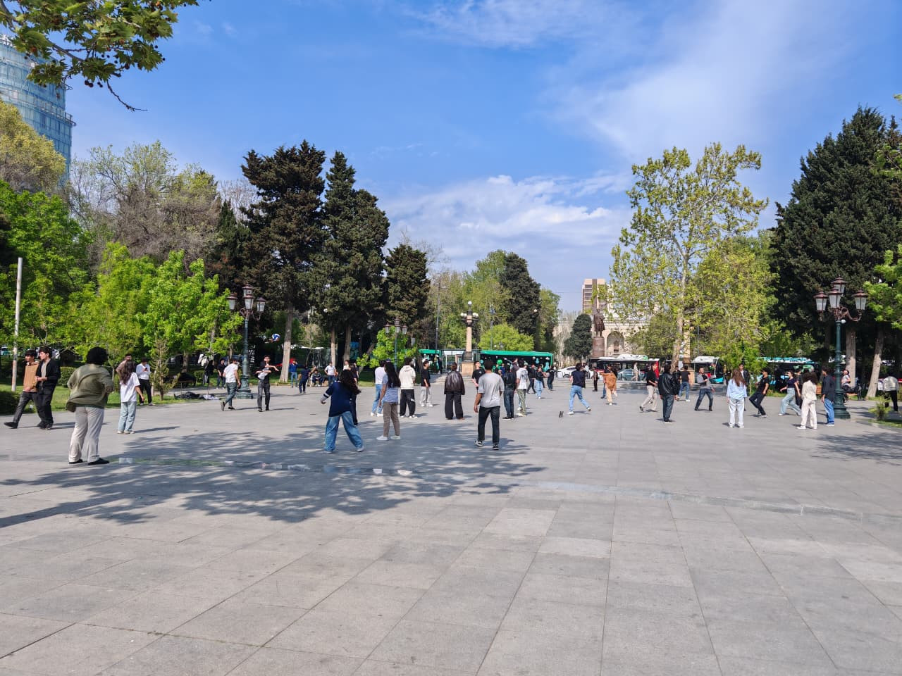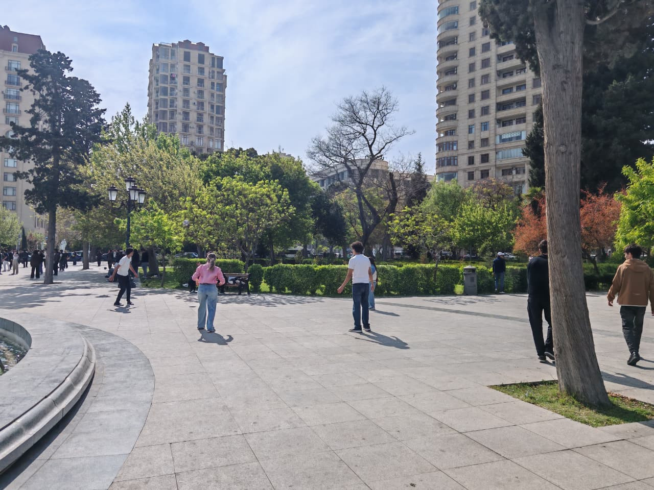 Bağın mərkəzi meydanına doğru irəlilədikcə səslər yüksəlir. Bu, sadəcə park deyil, sanki açıq hava altında böyük bir oyun meydançasıdır. Gənclərin qruplara bölünərək voleybol oynadığı, top qovduğu bu məkanda hər bir addımda dinamika var. Onların gülüşləri və bir-birlərinə səslənişləri parkın sükutunu xoş bir canlılıqla əvəz edir.