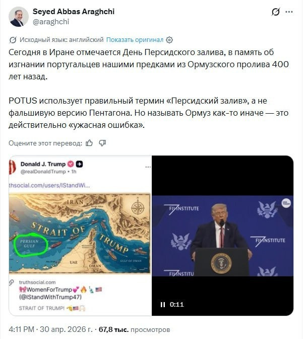 İranın xarici işlər naziri Abbas Əraqçi Hörmüz boğazının “Tramp boğazı” adlandırılması ilə bağlı iddialara münasibət bildirib. O qeyd edib ki, İran bu gün Fars körfəzi gününü qeyd edir və bu tarix 400 il əvvəl portuqalların Hörmüz boğazı bölgəsindən çıxarılması ilə bağlı hadisələrin xatirəsinə təsadüf edir.